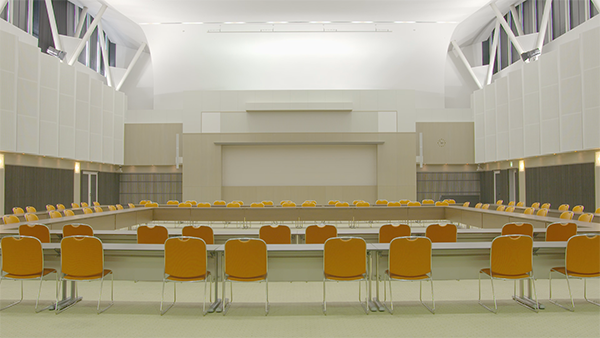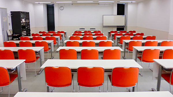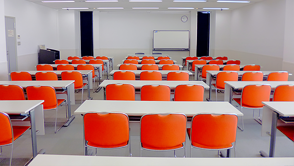 利用可能内容:集会・会議、講演、研修(座学) ・席数 63席(3人掛け) ・基本レイアウト スクール形式(机21台+前方1台) ・音響 スピーカーセット、ワイヤレスマイク4本、有線マイク4本 ・映像 天吊り液晶プロジェクター、天吊りプロジェクター(120インチ) ・インターネット 共有回線(有線1口、Wi-Fi接続可)