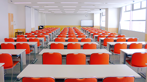 利用可能内容:集会・会議、講演、研修(座学) ・席数 117席(3人掛け) ・基本レイアウト スクール形式(机39台+前方1台) ・音響 スピーカーセット、ワイヤレスマイク6本、有線マイク4本 ・映像 天吊り液晶プロジェクター、天吊りプロジェクター(120インチ) ・インターネット 共有回線(有線1口、Wi-Fi接続可)